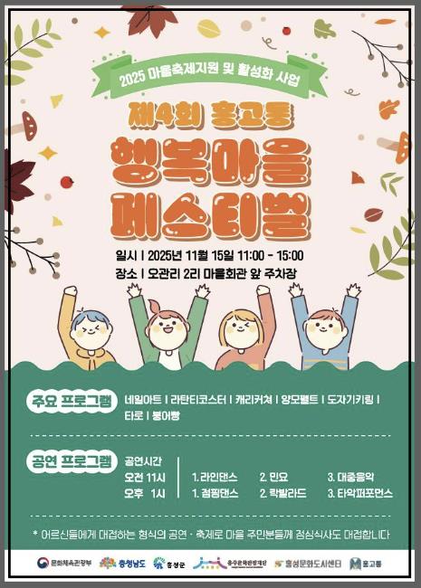 [뉴스다컴] 홍성군은 15일 오관2리 마을회관 주차장 일원(홍성읍 조양로143번길 35-12)에서 ‘제4회 홍고통 행복마을 페스티벌’을 개최한다고 밝혔다.