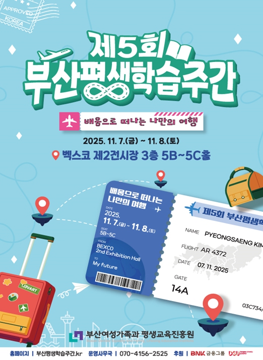 이번 행사는 '배움으로 떠나는 나만의 여행'이라는 주제로 시민들이 부산 평생교육을 한눈에 살펴보고, 평생교육기관 및 전문가 간 정보 공유를 통해 평생교육 우수사례를 확산하는 자리로 마련됐으며, ▲시민들이 평생교육을 접하고 체험하는 '평생교육 홍보·체험관 운영' ▲2025년 평생교육사업의 성과를 소개·공유하는 '성과공유회' ▲평소 갈고닦은 실력을 선보이는 '평생학습동아리 축제' ▲'문해교육 시화전 수상작품 전시' ▲다양한 부대행사 등으로 이틀간 진행된다.