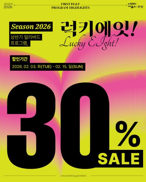 [뉴스다컴] 안동문화예술의전당은 상반기 주요 공연을 대상으로 30% 할인 혜택을 제공하는 특별 프로모션 ‘럭키에잇!’을 진행한다고 밝혔다.