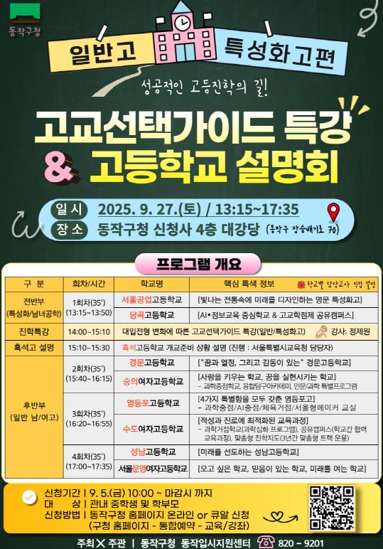 아울러 ‘고교 설명회’에는 관내 7개교와 관악구 2개교가 참여하며, 학교별 담당 교사가 직접 특화 프로그램과 진학 사례 등을 소개하고 학부모와 학생들의 궁금증을 해소한다.