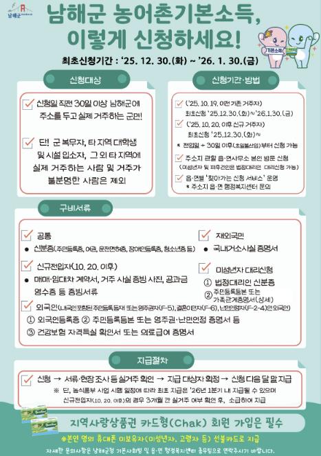 [뉴스다컴] 남해군은 ‘농어촌 기본소득 시범사업’ 신청 접수를 오는 12월 30일부터 2026년 1월 30일까지 실시한다고 밝혔다.