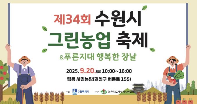 [뉴스다컴] 농업인과 시민이 함께하는 ‘제34회 수원시 그린농업축제’가 9월 20일 오전 10시부터 오후 4시까지 탑동시민농장에서 열린다.