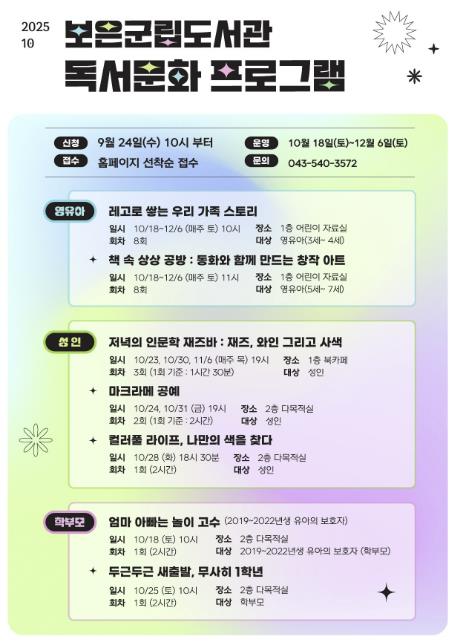 [뉴스다컴] 보은군립도서관은 오는 24일 오전 10시부터 ‘2025년 하반기 프로그램’ 수강생 모집에 들어간다. 이번 프로그램은 유아, 성인, 부모 등 다양한 계층을 대상으로 총 7개 강좌가 마련됐다.