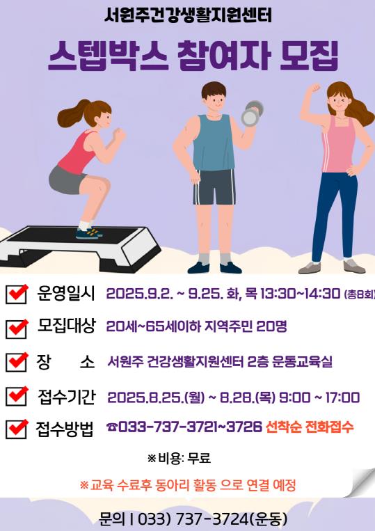 [뉴스다컴] 서원주건강생활지원센터는 시민들의 건강한 운동 실천과 삶의 질 향상을 위해 ‘다이어트 스텝박스 운동’ 프로그램 참여자를 모집한다.