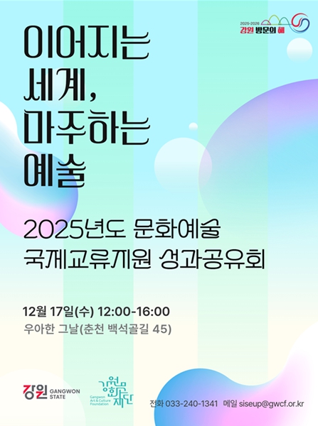 [뉴스다컴] 강원문화재단은 2025년도 문화예술 국제교류지원사업에 참여한 예술인들과 함께 12월 17일 춘천에서 성과공유회 '이어지는 세계, 마주하는 예술' 행사를 성황리에 마무리했다고 밝혔다.