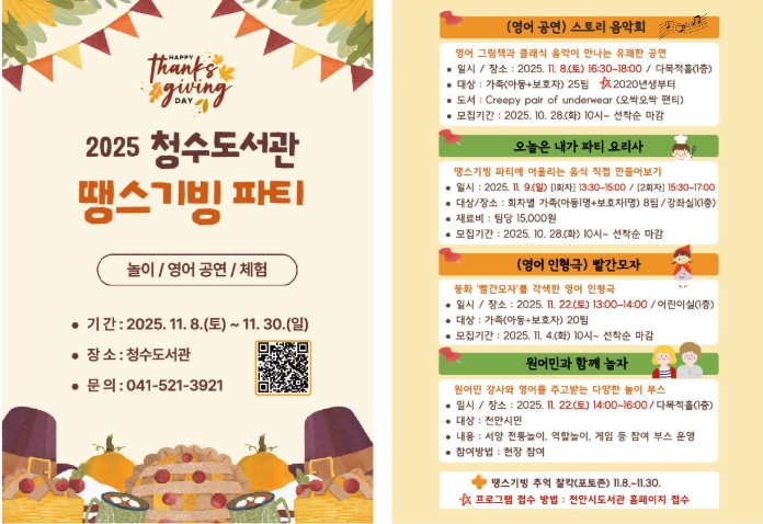 [뉴스다컴] 천안시 청수도서관은 오는 8~ 30일 ‘2025 땡스기빙 파티’를 연다고 6일 밝혔다.