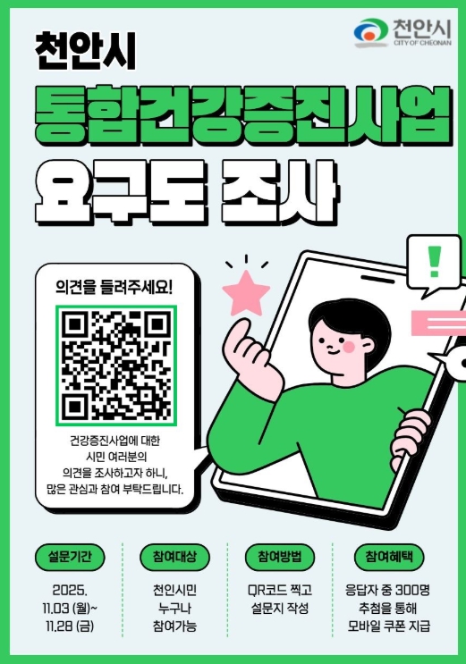 [뉴스다컴] 천안시는 오는 28일까지 내년 지역사회 통합건강증진사업 추진을 위한 주민요구도 조사를 실시한다고 6일 밝혔다.