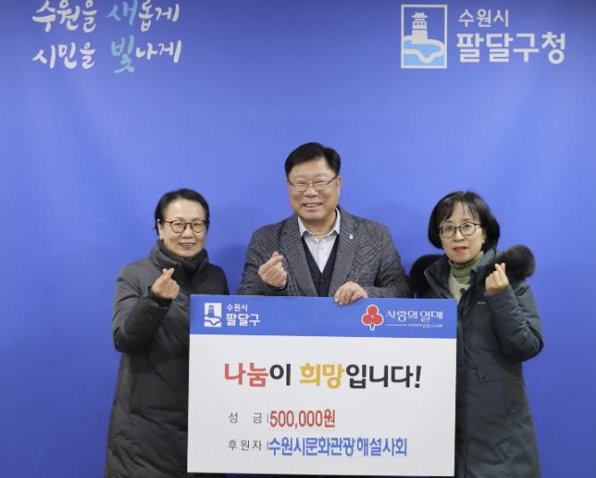 [뉴스다컴] 수원시 팔달구는 지난 29일, 수원문화관광해설사회에서 기부하는 성금 50만원 전달식을 가졌다고 밝혔다.