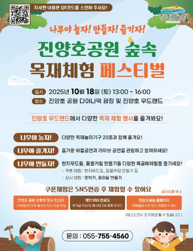 [뉴스다컴] 진주시는 오는 10월 18일 오후 1시부터 4시까지 진양호공원 다이나믹 광장과 진양호우드랜드 일원에서 『나무야 놀자! 만들자! 즐기자! 진양호 공원 숲속 목재체험 페스티벌』을 개최한다.