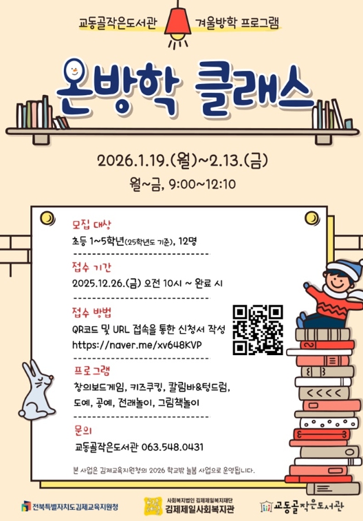 [뉴스다컴] 김제시는 교동골작은도서관이 겨울방학을 맞아 아동을 위한 특별 프로그램인 ‘온(溫)방학 클래스’를 운영한다고 밝혔다.