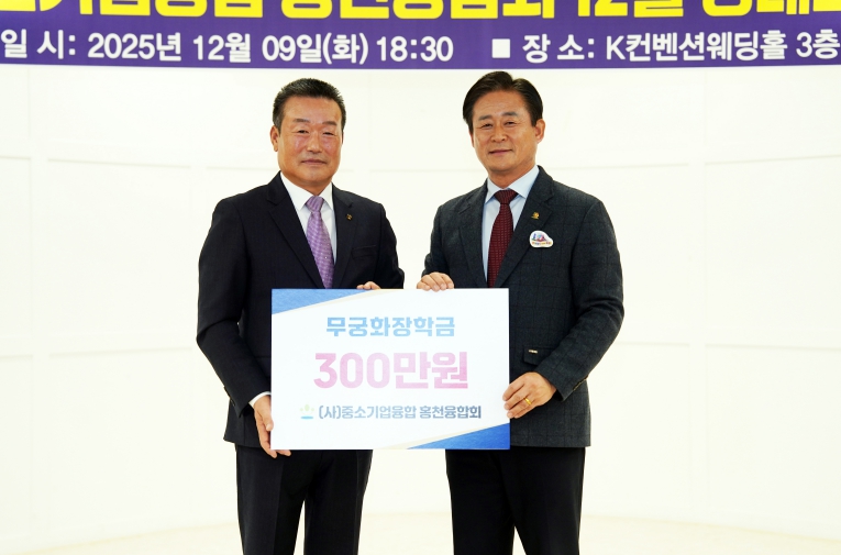 [뉴스다컴] (사)중소기업융합 홍천융합회는 12월 9일 K컨벤션웨딩홀 3층에서 열린 ‘2025년 중소기업융합 홍천융합회 송년회’에서 무궁화장학금 300만 원을 홍천군에 기탁하고, 연탄 3,000장은 (사)이웃에 지정 기탁했다고 밝혔다.