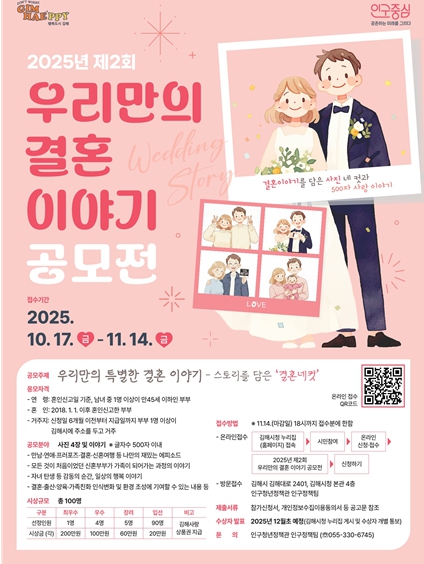 [뉴스다컴] 김해시는 시민 참여와 공감을 기반으로 결혼의 긍정적 의미를 확산하고 가족의 가치를 널리 알리기 위해‘제2회 우리만의 결혼 이야기 공모전’을 개최한다고 21일 밝혔다.