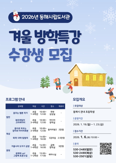 [뉴스다컴] 동해시는 2026년 겨울방학을 맞아 관내 초등학생을 대상으로 동해시립도서관에서 겨울방학 특강 프로그램을 운영한다고 밝혔다.