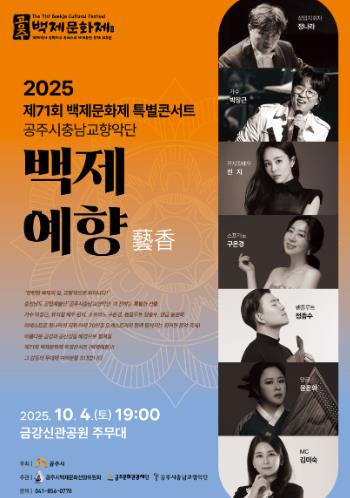 [뉴스다컴] 공주시충남교향악단은 제71회 백제문화제를 맞아 오는 10월 4일 저녁 7시, 공주 금강신관공원 주무대에서 특별콘서트 ‘백제 예향’을 개최한다고 밝혔다.