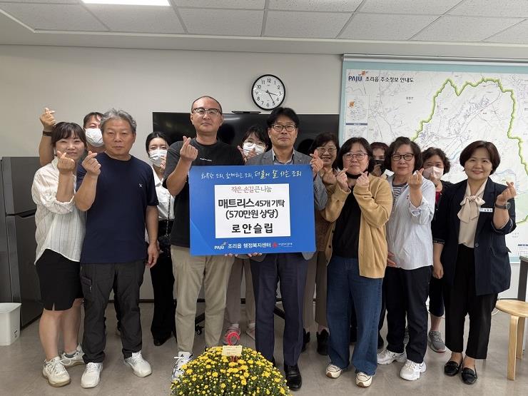 [뉴스다컴] 파주시 조리읍은 지난 23일, 관내 가구업체 ’로안슬립‘으로부터 추석을 맞아 관내 취약계층을 위한 매트리스 45개(약 570만 원 상당)를 기탁 받았다고 밝혔다.