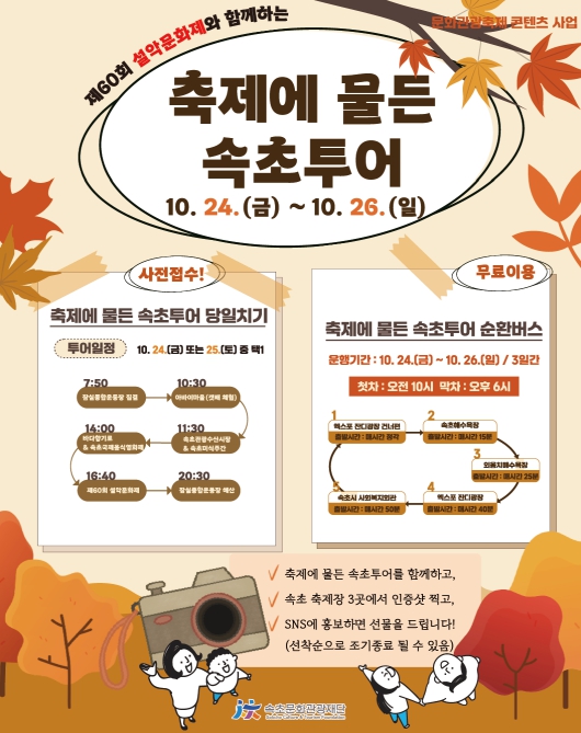 [뉴스다컴] (재)속초문화관광재단은 제60회 설악문화제를 맞아 수도권 시민들이 가을 정취 가득한 속초의 대표 축제들을 한 자리에서 체험할 수 있도록 특별 기획된 문화관광 콘텐츠 ‘축제에 물든 속초투어’를 운영한다.