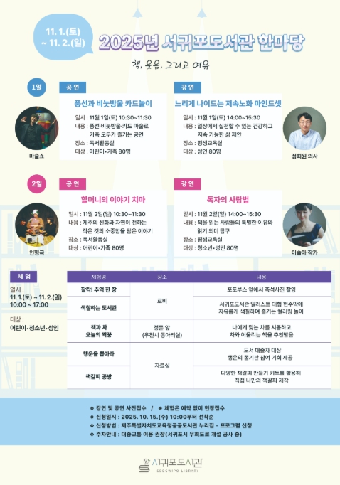 [뉴스다컴] 제주도교육청 서귀포도서관은 11월 1일과 2일 양일간 지역 주민이 함께 즐기는 독서문화 축제 ‘2025년 서귀포도서관 한마당’을 개최한다.