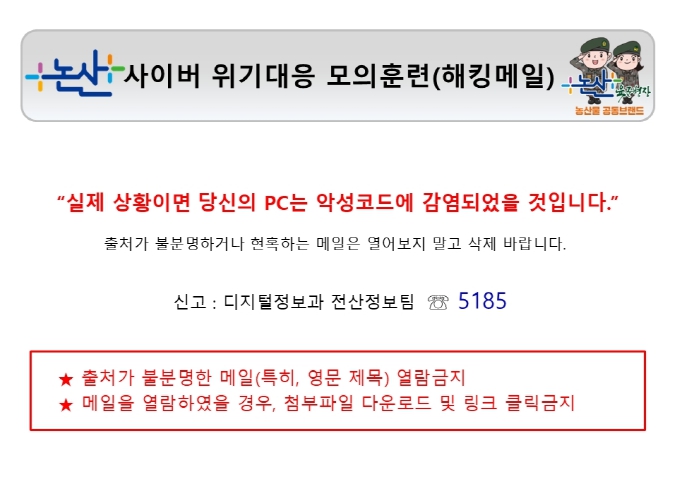 논산시는 5일과 6일 이틀간 전 직원을 대상으로 ‘해킹메일 모의훈련’을 진행했다.