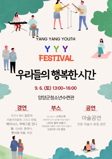 [뉴스다컴] 양양군 청소년수련관은 오는 9월 6일 오후 1시부터 4시까지 ‘우리들의 행복한 시간’을 주제로 청소년 축제를 개최한다.