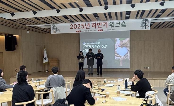 [뉴스다컴] 동두천시 시설관리공단은 지난 22일 동두천 자연휴양림 세미나실에서 열린 2025년 하반기 워크숍에서 인권경영 헌장 개정 및 선포식을 개최했다고 밝혔다.