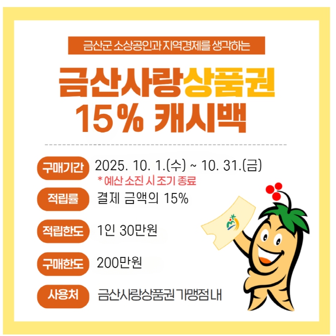금산군, 10월 금산사랑상품권 캐시백 적립률 15% 유지