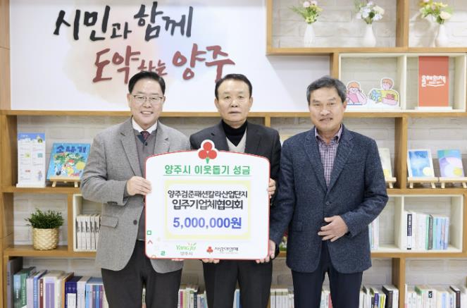 [뉴스다컴] 양주시가 지난 15일 시장실에서 양주검준패션칼라사업협동조합을 비롯한 관련 단체 및 기업으로부터 이웃돕기 성금과 성품을 기탁받았다고 밝혔다.