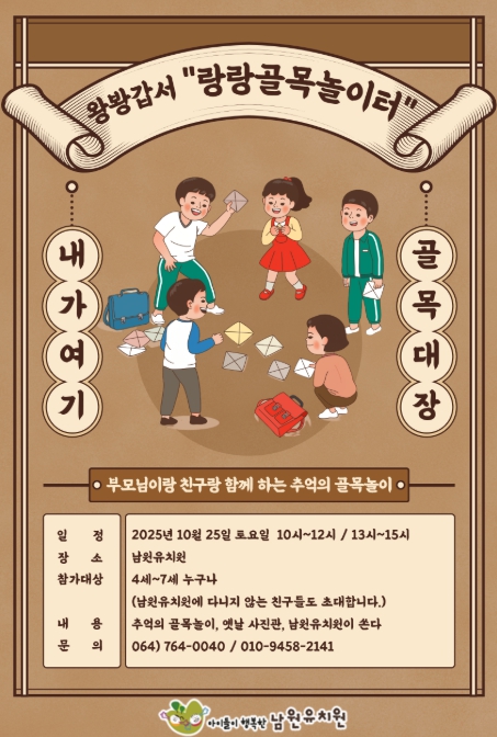 [뉴스다컴] 제주도교육청 남원유치원은 25일 오전 10시와 오후 1시, 두 차례에 걸쳐 남원유치원에서 지역공동체 교육 프로그램인‘왕봥갑서 랑랑골목놀이터’를 운영한다.