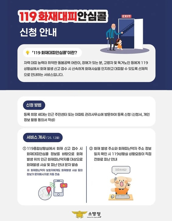 ‘119 화재대피안심콜 서비스’는 돌봄 공백 아동, 장애인, 고령자, 독거노인 등 화재 상황에서 스스로 대피가 어려운 대상자를 사전에 등록하면 화재 발생 시 119종합상황실의 신고 접수 단계부터 해당 정보를 확인해 신속하고 안전한 대피를 돕는 맞춤형 안전지원 서비스다.