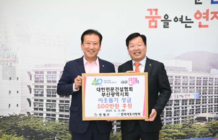 [뉴스다컴] 연제구는 11월 11일 대한전문건설협회 부산광역시회(회장 김형겸)로부터 이웃돕기 성금 500만원을 기탁 받았다. 기탁 받은 성금은 취약계층 지원을 위한 사업에 이용될 예정이다.