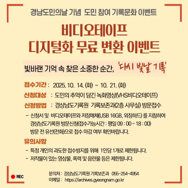[뉴스다컴] 경상남도기록원은 10월 14일부터 31일까지 도민이 소중한 추억을 오래도록 보존할 수 있도록 '빛바랜 기록 속 찾은 소중한 순간 – 다시 빛날 기록'이라는 주제로 비디오테이프 디지털 변환 이벤트를 추진한다고 밝혔다.