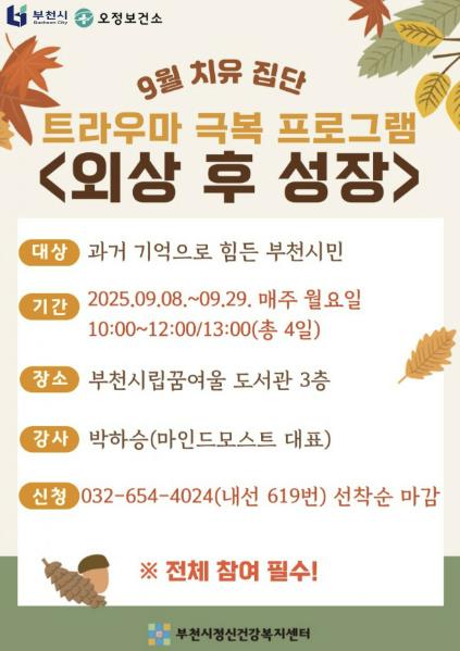 [뉴스다컴] 부천시는 부천시정신건강복지센터와 함께 9월 8일부터 9월 29일까지 부천시립꿈여울도서관에서 과거 기억으로 어려움을 겪는 부천시민을 대상으로 트라우마 치유집단 프로그램 ‘외상 후 성장’을 운영한다고 8월 19일 밝혔다.