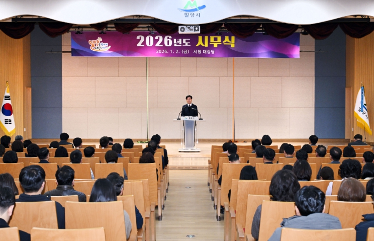 [뉴스다컴] 밀양시는 2일 시청 대강당에서 본청 및 읍면동, 직속 기관, 산하기관 직원 등 300여 명이 참석한 가운데 2026년 시무식을 개최하고 새해 업무를 시작했다.
