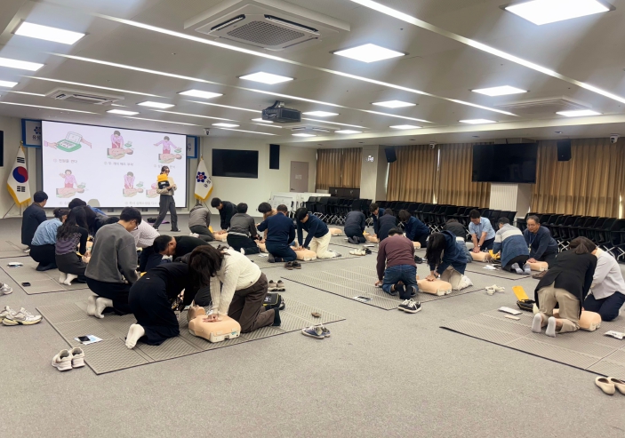 교육 내용은 ▲응급 상황 시 행동 요령 ▲성인 가슴 압박 심폐소생술 ▲자동심장충격기(AED) 사용법 등 실습 위주로 구성됐다.