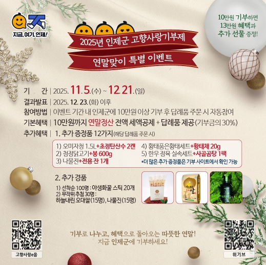 [뉴스다컴] 인제군이 연말을 맞이하여 고향사랑기부제 특별 이벤트를 오는 12월 21일까지 진행한다.