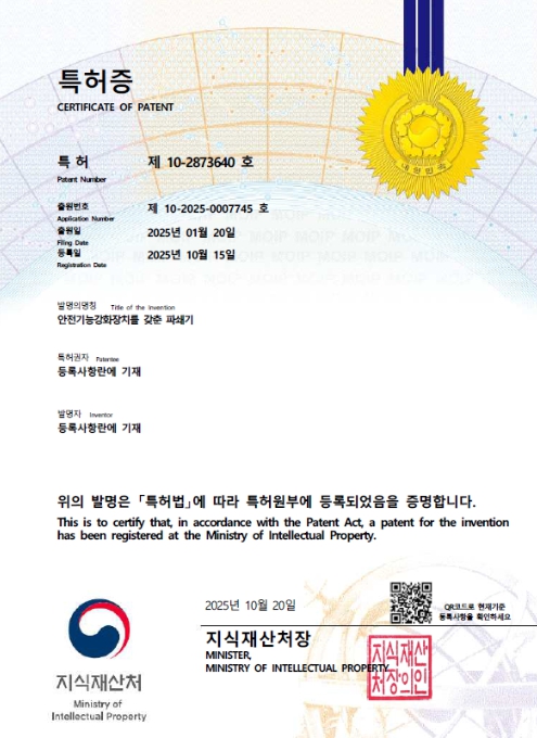 [뉴스다컴] 제주특별자치도 농업기술원은 ㈜한성티앤아이와 공동으로 개발한 무선인식(RFID) 기반 안전기능 강화 장치를 갖춘 파쇄기 기술이 기술개발 특허로 등록됐다고 밝혔다.