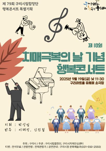 [뉴스다컴] 구리시는 오는 9월 19일 오전 11시 30분부터 오후 12시 30분까지 구리아트홀 유채꽃 소극장에서'제18회 치매 극복의 날 기념 행복 콘서트'를 개최한다고 밝혔다.