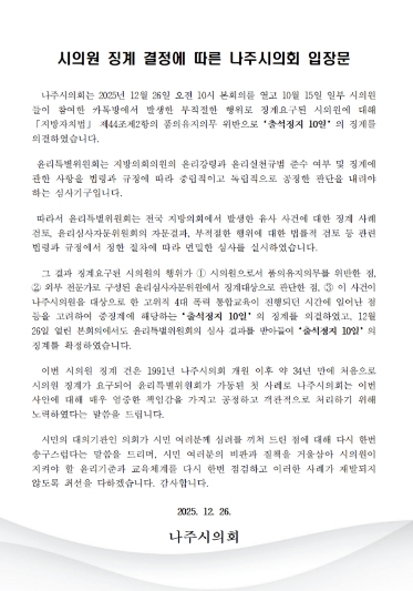 [뉴스다컴] 나주시의회는 2025년 12월 26일 오전 10시 본회의를 열고, 10월 15일 일부 시의원들이 참여한 카톡방에서 발생한 부적절한 행위로 징계요구된 시의원에 대해 '지방자치법' 제44조제2항의 품의유지의무 위반으로 ‘출석정지 10일’의 징계를 의결하고 입장문을 발표했다.