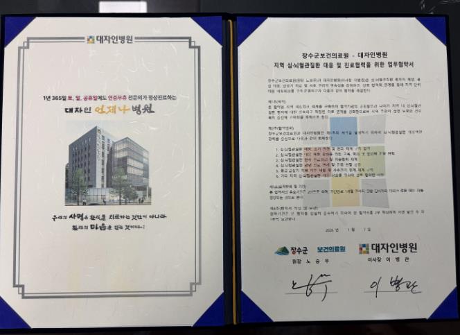 [뉴스다컴] 장수군은 대자인병원과 심뇌혈관질환 발생 시 신속하고 효과적인 대응을 위해 상호 진료협력 체계를 구축하는 ‘심뇌혈관질환 대응 진료협력 협약(MOU)’을 체결했다고 9일 밝혔다.