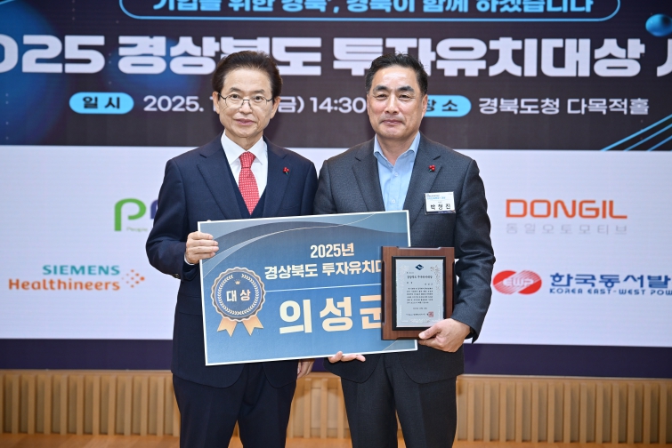 [뉴스다컴] 의성군은 지난 19일 경북도청에서 열린 ‘2025년 경상북도 투자유치대상’ 시상식에서 투자유치 활성화 성과를 인정받아 3년 연속 대상을 수상했다고 밝혔다.