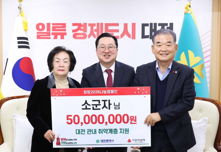 [뉴스다컴] 대전시는 15일 오전 시청 10층 응접실에서 아너소사이어티 회원인 소군자 기부자(124호)로부터 대전사회복지공동모금회를 통해 관내 취약계층 지원을 위한 성금 5천만 원을 전달받았다.