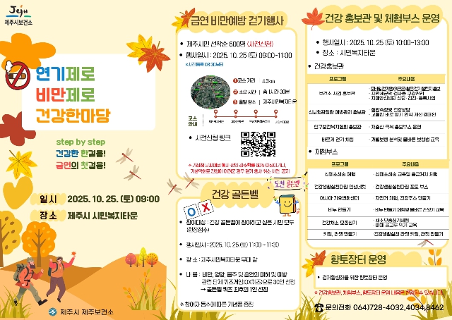 [뉴스다컴] 제주시는 10월 25일 오전 9시 시민복지타운 광장에서 금연환경 조성과 비만 예방을 위한 ‘연기 제로 비만 제로 건강한마당’을 개최한다.