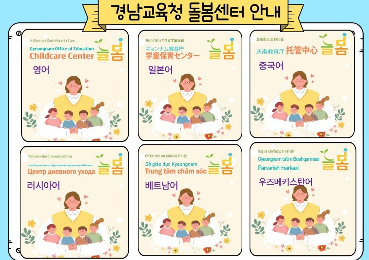 [뉴스다컴] 경상남도교육청은 다문화 가정과 외국인 학부모가 돌봄 서비스를 쉽게 이해할 수 있도록 경남교육청 돌봄센터 ‘늘봄’ 안내자료를 6개 국어로 제작해 배포했다. 지원 언어는 영어, 일본어, 중국어, 베트남어, 러시아어, 우즈베키스탄어이다.