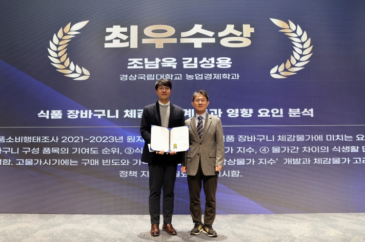[뉴스다컴] 경상국립대학교(GNU·총장 권진회) 농업경제학과 박사과정 조남욱 씨가 12월 12일 서울 양재aT센터에서 열린 ‘2025 식품소비행태조사 활용 우수논문 경진대회’에서 ‘최우수논문상’(지도교수 김성용)을 수상했다.