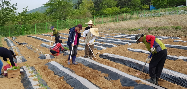 | ▲ 체류형농업창업지원센터 텃밭에서 교육생들이 실습하는 모습 |