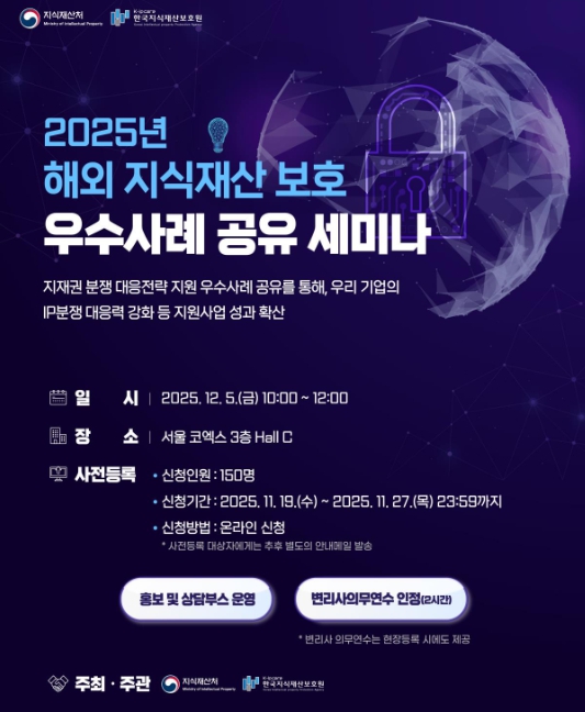 [뉴스다컴] 지식재산처는 12월 5일 10시 코엑스(서울시 강남구)에서 ‘2025년 해외 지식재산 보호 우수사례 공유 세미나’를 개최한다. 이번 행사는 2025 대한민국 지식재산대전의 일부 행사로 진행되며, 우리 기업이 해외 시장에서 자주 마주하는 지식재산 분쟁에 효과적으로 대응할 수 있게 실제 우수 사례와 대응 전략을 공유하는 자리로 마련됐다.