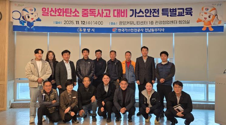 [뉴스다컴] 광양시는 지난 11월 12일 중마동 커뮤니티센터 소회의실에서 한국가스안전공사 전남동부지사와 함께 23개 가스시공업체 담당자를 대상으로 일산화탄소 중독사고 예방을 위한 가스 안전 특별교육을 실시했다고 밝혔다.