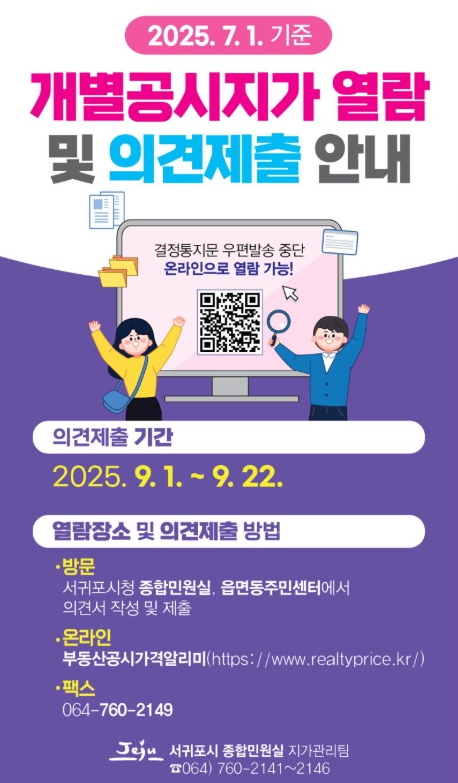 [뉴스다컴] 서귀포시는 2025년 7월 1일 기준 개별공시지가 산정을 완료하고, 9월 1일부터 9월 22일까지 개별공시지가 열람 및 의견 제출 기간을 운영한다고 밝혔다.