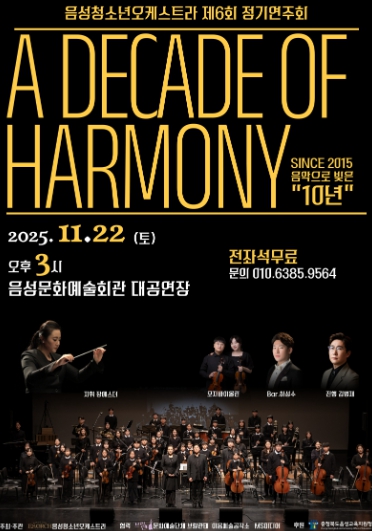 [뉴스다컴] 충청북도음성교육지원청의 방과후학교 민간공모사업 운영 단체인 음성청소년오케스트라(지휘 장에스더)가 창단 10주년을 맞이하여 오는 11월 22일 오후 3시, 음성문화예술회관 대공연장에서 제6회 정기연주회 ‘A DECADE OF HARMONY’를 개최한다.