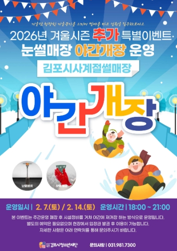 이번 야간개장은 2월 7일과 2월 14일 총 2회에 걸쳐 진행되며, 운영시간은 오후 6시부터 9시까지(3시간)이다. 앞서 1월 17일 야간 개장 시범운영을 실시한 결과 시민들의 높은 호응이 확인됨에 따라 추가 야간개장을 추진하게 됐으며, 2월 15일을 끝으로 김포시 사계절썰매장 겨울시즌 운영을 마무리할 예정이다.