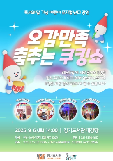 [뉴스다컴] 김포시 장기도서관은 오는 9월 6일 오후 2시, 대강당에서 9월 독서의 달을 맞아 어린이 뮤지컬 난타공연 ‘오감만족 춤추는 요리공연(쿠킹쇼)’를 운영한다고 밝혔다.